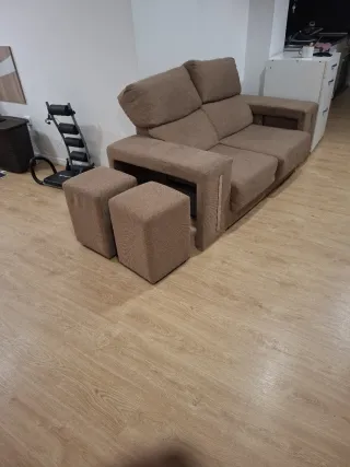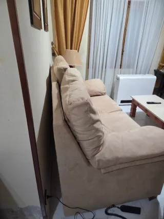 Conjunto de muebles para el salón. Sofá cama 3 plazas + mesa de centro + aparador – salón completo Se vende sofá cama de 3 plazas muy cómodo, en color beige y tela antimanchas y en buen estado. Incluye también mesa de centro de madera maciza con cajones y aparador auxiliar de madera. Todo está bien cuidado y en buen estado, perfecto para amueblar un salón de forma práctica y elegante.
