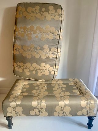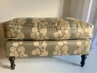 Elegante otomana o reposapiés con un bonito estampado. Marca KA International. - Tapicería en tonos grises y beige. - Patas de madera oscura.