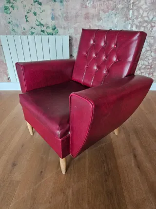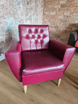 Elegante sillón de estilo vintage, tapizado en piel sintética de color granate. Sus patas de madera le dan un toque distintivo. - Diseño capitoné en el respaldo. - Brazos amplios y cómodos. - Patas cónicas de madera.