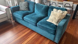 Cómodo sofá de tres plazas en un bonito color azul verdoso. - Tapicería de terciopelo. - Diseño moderno y elegante. - Comprado en 2019 - Usado pero en buen estado