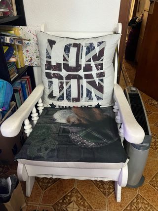 Acogedor sillón con un diseño único y llamativo. Perfecto para añadir un toque de estilo a cualquier rincón. - Cojín trasero con estampado de la Union Jack y LONDON. - Cojín del asiento con imagen de un perro y detalles verdes. El sillón era color roble esta pintado en blanco #sofa #sillon #silla