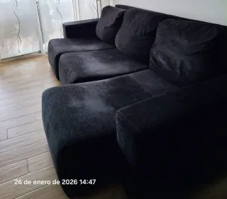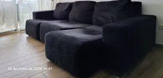 Sofá chaiselongue de tres metros con capacidad para cinco personas, muy cómodo. Sus asientos deslizantes ofrecen comodidad adicional. Precio no negociable. En la foto la tela hace aguas, no es desgaste, es el tipo de tela. - Diseño moderno en tono oscuro. - Tapicería de tela. - Amplia zona de chaiselongue (lado izquierdo)
