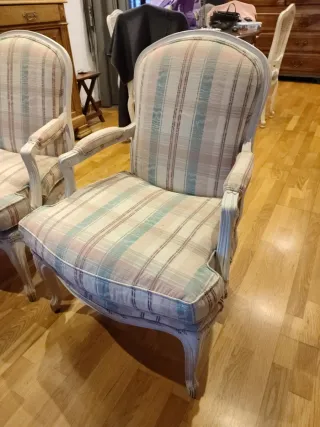 Elegante sillón estilo Luis XV, con un diseño clásico y refinado. - Tapicería de tela con estampado de cuadros. - Estructura de madera tallada. - Brazos curvos y asiento confortable. Con almohadón de plumas. Tapicería perfecta. Dispongo de una pareja. Precio unidad 160€, si compras los dos arreglo el precio a 280€ M didas 66 x 65 x 92 cm
