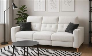 Sofá de tela de 200 cm de largo. Su diseño moderno y su tapizado en tono crudo lo hacen ideal para cualquier salón. - Funda con bolsillos laterales.