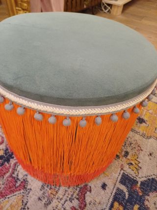 Puff redondo de estilo vintage con un diseño elegante. - Detalle de flor de lis. - Inscripción Fleur de Lis. - Acabado capitoné. Pequeño descosido que se ve en la última foto. Lo puedo llevar por zona norte, Navarra,la rioja Burgos etc