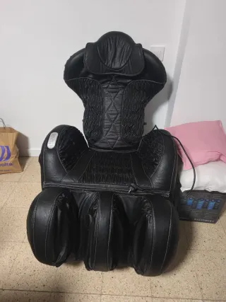 Precio original 350€ Sillon de masaje por vibración en 4 zonas: Cuello, espalda, lumbar/glúteos y piernas. 8 potentes motores silenciosos (Incluye mando a distancia) Reclinacion manual 160º y reposapies extensible Sistema de calor lumbar Tapizado de piel sintetica Tapizado un poco estropeado. El resto funciona perfectamente