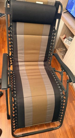 Sillón reclinable de la marca BUJOG, ideal para disfrutar del exterior. Es cómodo y fácil de plegar. - Estructura metálica. - Tejido de tela con rayas beige y negras.