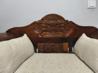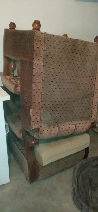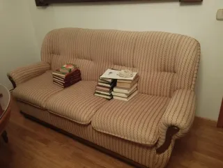 Conjunto de sofá cama y dos sillones. - Tapicería de tela. - Estructura de madera. Son de muy buena calidad. Han estado guardados y tienen polvo y hace falta encolar alguna pieza pero sin roces ni mascotas ni nada de eso. Los regalo . Están en Ciudad Real capital. Solo hay que venir a por ellos
