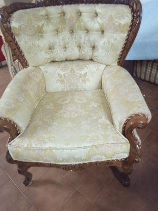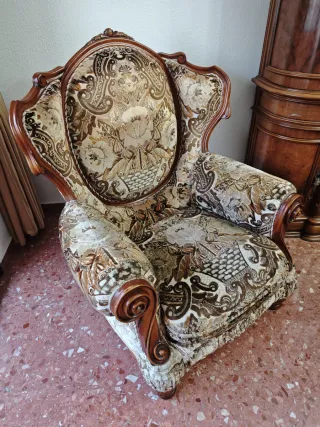 Sillones en total 4, cada uno 20€. Precioso para tapizas como desees. Elegante sillón con un diseño clásico y tapicería detallada. - Estructura de madera robusta. - Tapicería de tela con estampado floral. - Tonos beige y marrón que combinan fácilmente.