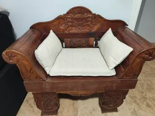 Este sillón de madera maciza presenta un diseño antiguo y tallado a mano, aportando un toque clásico a cualquier espacio. Se vende junto con sus cojines. - Estructura de madera robusta y duradera. - Cojines de asiento y respaldo incluidos.