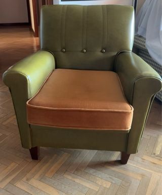 Cómodos sillones con un diseño moderno. - Tapicería en piel sintética verde. - Cojín de asiento en terciopelo naranja. - 50 euros cada uno