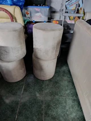 Puf redondo de tela, ideal para añadir un toque de estilo a cualquier espacio. - Diseño cilíndrico. - Acabado en tela. - Tonos beige y gris abría que limpiarlos o forrarlos ya se venden por cese de negocio no ago envios precio por cada uno