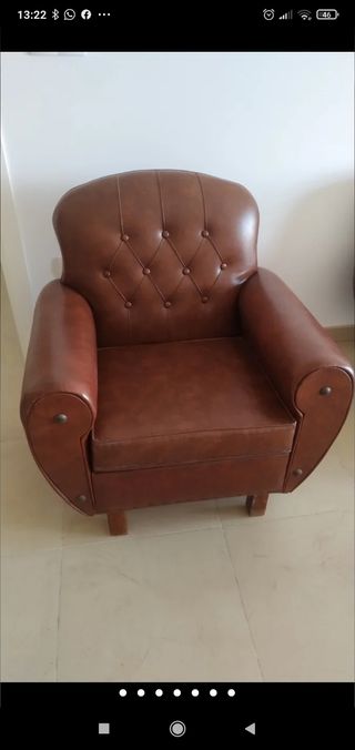 Precioso sillón de estilo vintage. Ideal para darle un toque rústico a tu hogar. - Estructura de madera maciza. - Asiento de piel sintética. - Patas torneadas. Los dos 25 y uno solo 15