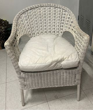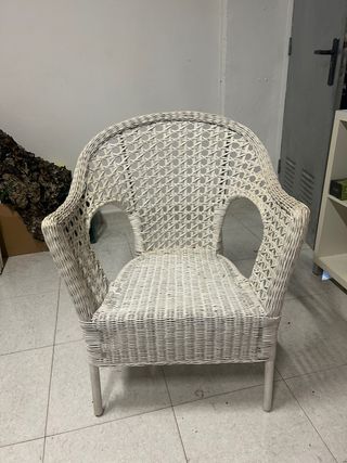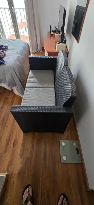 Set de 4 piezas de mueble de jardín. Sofá de 2 plazas medidas 132x66x39 altura cojin 1 mesita de centro de 56x56x34 altura 2 butacas de 74x66x39 altura cojin. Una de las butacas tiene un daño en un lateral. Esa es de regalo. Precio nuevo 199€ Sin uso a penas. Urge por mudanza.
