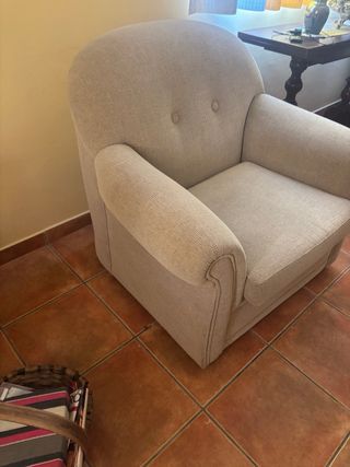 Cómodo sillón individual de tela, ideal para relajarse. Se encuentra en buen estado. Dispongo de 2 sillones iguales. Precio por unidad. - Diseño clásico con botones. - Perfecto para cualquier habitación.
