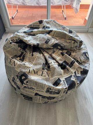 Cómodo puff con un diseño original inspirado en periódicos. Su tamaño XL lo hace perfecto para relajarse. - Estampado de periódico en beige y negro. - Funda de tela.