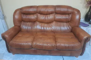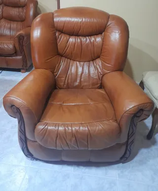 Conjunto de mobiliario para salón compuesto por un sofá y dos sillones. Se venden juntos o por separado. - Sofá de tres plazas. - Dos sillones individuales. - Acabado en piel. - Base de madera. El sofá tiene alguna manchita que se aprecia en las fotos El precio se podría negociar