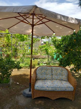 Sillón de mimbre +parasol + pie de hierro relleno de hormigon, como nuevo (paraso medida 280 de diametro +pie=60€) (sillon medidas de asiento 120.(135×70×90. 125€ )