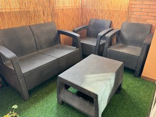 Esta en buen estado. Solo l hace falta un lavado fuerte. Conjunto de muebles de exterior para terraza o jardín. - Sofá de dos plazas. - Dos sillones individuales. - Mesa auxiliar. - Diseño tipo ratán. - Material resistente.