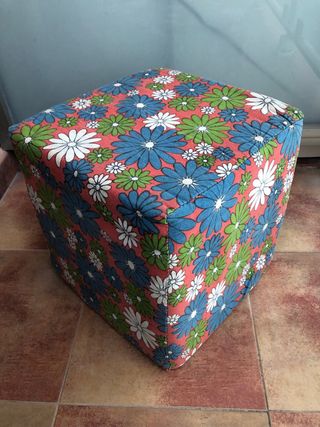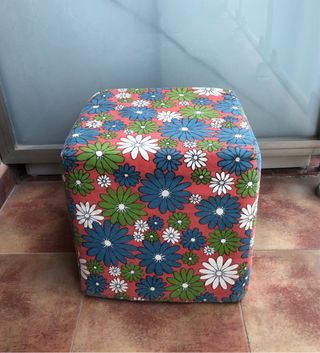 Puff cuadrado con un alegre estampado floral. Interior de espuma. Ideal como mesita auxiliar, reposapies, elemento decorativo ... etc - Diseño compacto y versátil. - Perfecto para cualquier espacio. Muy buen estado. Medidas 33 x 33 x 33 cm
