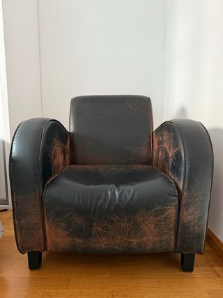 Este sillón de piel aporta un toque clásico y elegante a cualquier espacio. Su diseño atemporal y su acabado desgastado le dan un carácter único. - Acabado desgastado con detalles en marrón y negro. - Tapicería de piel. - Muy cómodo y elegante. - Sin roces ni roturas.