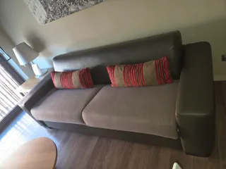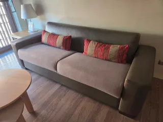 Sofá cama de tela en color gris. Es un mueble versátil que puede servir como asiento o como cama. - Diseño moderno. - Agradable al tacto. Tiene un poco de detalles en la parte de abajo mi pequeño amiguito lo ha roto pero está en buenas condiciones