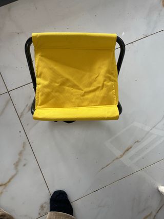 Silla de playa plegable con un diseño práctico y llamativo. - Estructura de metal resistente. - Bolsa de tela amarilla integrada con texto. - Asiento y respaldo de tela.