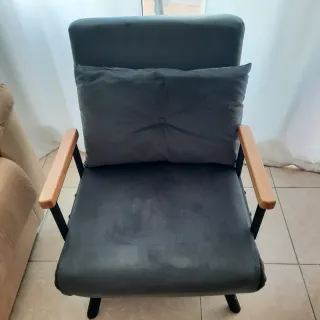 Cómodo sillón balancín de Ikea, recién montado, con su reposapiés a juego. NUEVO a estrenar no podemos devolverlo xq no encontramos el ticket de compra - Estructura de madera curvada. - Tapicería de tela en tono gris verdoso. Precio del conjunto total pagado 363€ y lo vendemos en solo 180€ (ya precio mínimo, no negociable)