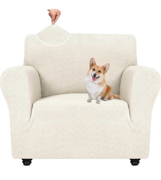 Funda para sillón, nueva y con un diseño moderno. - Tejido elástico y antideslizante. - Color beige con un sutil patrón. - Protege tu sillón con estilo.