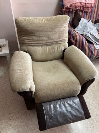 Cómodo sillón reclinable con un diseño moderno. - Tapicería en tela y piel. - Tonos beige y marrón. Está en perfecto estado y es el asiento más cómodo que tenemos, pero nos falta espacio por eso lo vendemos.