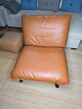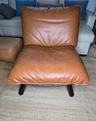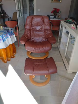 Cómodo sillón relax de cuero en perfecto estado, casi nuevo. Incluye su reposapiés a juego. - Base de madera. - Tapicería de cuero.