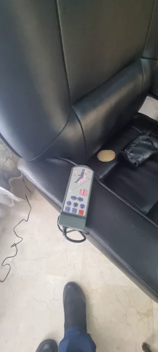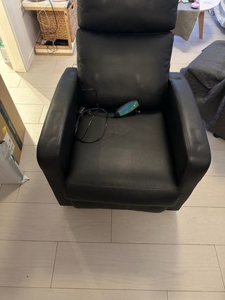 Sillón de masaje de la marca jysk con un trozo de madera roto en el respaldo se puede reparar facil de alli su precio.