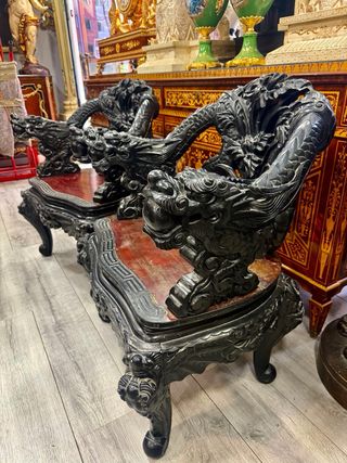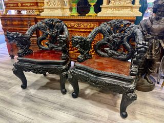 Elegante par de sillones de estilo chino, con intrincados detalles de dragones tallados en madera. - Diseño con dragones en brazos y respaldo. - Asientos de madera con acabado rojo. - Base robusta con patas ornamentadas. ☎622 37 78 65☎689 49 79 66☎️️️