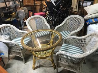 Conjunto de mesa y cuatro sillones de terraza, perfecto para disfrutar del aire libre. El diseño en mimbre le da un toque acogedor. - Mesa con sobre de cristal. - Sillones con cojines a rayas. psd: los sillones fueron pintados, (color original verde)