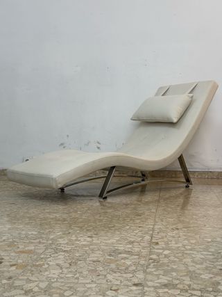 Elegante sillón relax con un diseño moderno y curvo. Aporta un toque de sofisticación a cualquier espacio. - Tapicería en cuero blanco. - Base y estructura de metal plateado. - Incluye cojín reposacabezas.