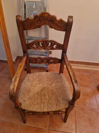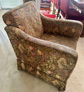 Acogedor sillón de madera con un cojín decorativo. - Diseño clásico y robusto. ( los apoyabrazos parecen arañados pero NO son arañazos) - Cojín con estampado de pájaros y flores. - Asiento de tela tejido.