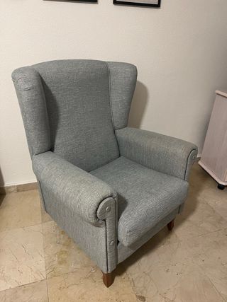 Acogedor sillón orejero en un bonito tono grisáceo. Se encuentra en buen estado y es perfecto para añadir un toque de confort a tu hogar. - Tapicería de tela. - Estructura de madera.