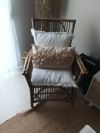 Acogedor sillón de bambú con cojines. - Estructura de bambú. - Cojines de tela. - Diseño natural y relajante. Tengo dos unidades precio por unidad con 3 cojines cada uno