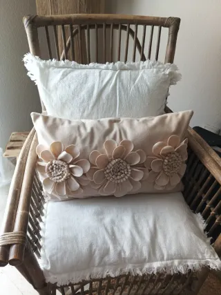Conjunto de dos sillones de bambú con cojines decorativos. - Cojines con diseño floral. - Estructura de bambú - Cojines en tonos beige y blanco. 50 unidad con cojines blancos 30 unidad sin cojines
