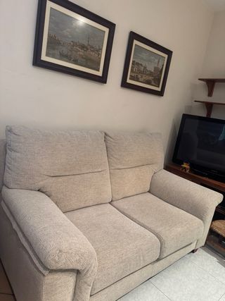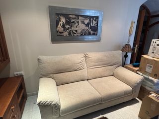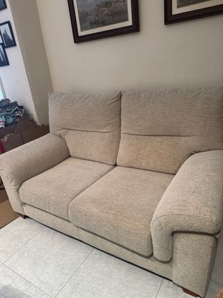Cómodo sofá de tres plazas en tono beige. Su diseño moderno se adapta a cualquier sala de estar. - Tapicería de tela. - Estructura robusta. TENGO UNO IGUAL DE DOS PLAZAS