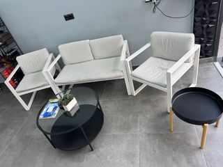 Conjunto de mobiliario de sala de estar con un diseño contemporáneo. - Estructura de madera blanca. - Cojines de tela en tono claro. - Mesa de centro redonda con superficie de cristal. - Mesa auxiliar redonda negra. Se regala 2 mesitas pequenias