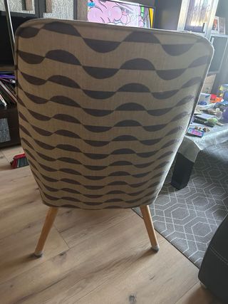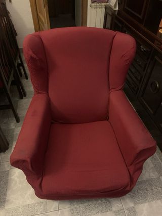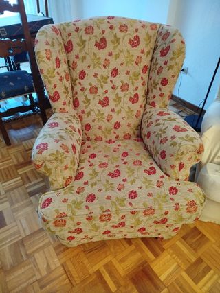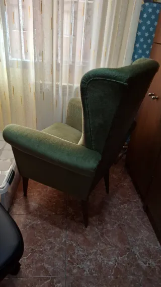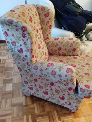 Sillón orejero con patas de madera. Cómodo. No es bajo, Buena altura.