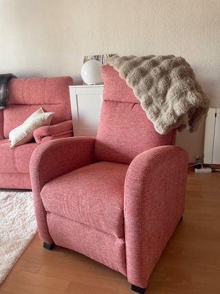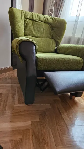 Cómodo sillón individual reclinable con un diseño moderno y tresillo de dos plazas a juego con banquetas extensibles. Hay que recogerlo en domicilio y llevárselo uno mismo