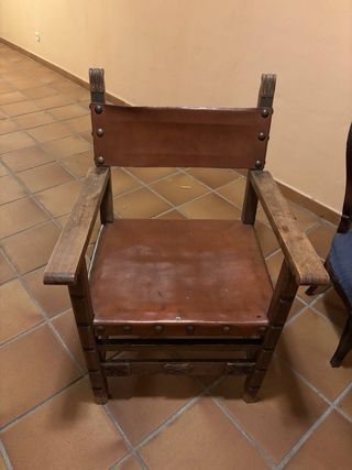Este sillón combina un estilo medieval con materiales de calidad. - Estructura robusta de madera. - Asiento y respaldo de cuero. - Detalles metálicos decorativos. - Medidas: 95 x 60 x 65 cm.