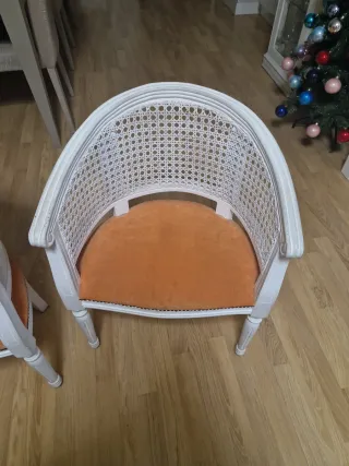 Elegante sillón de Maison du Monde con un diseño único. - Estructura de madera y ratán. - Cojín de asiento en color naranja vibrante. - Respaldo de ratán calado.