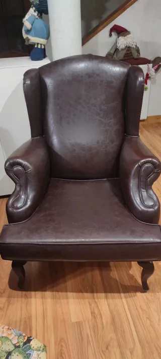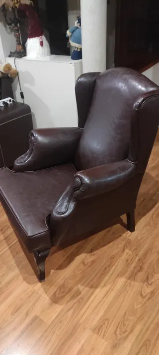 Acogedor sillón orejero con un diseño clásico y elegante. Su tapicería le da un toque sofisticado a cualquier espacio. - Tapicería de piel sintética. - Color marrón intenso.