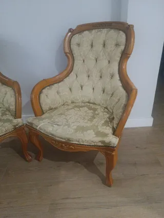 Conjunto de dos sillones con un diseño clásico y elegante. - Estructura robusta de madera maciza. - Tapicería de tela con estampado floral. - Cojines decorativos incluidos.