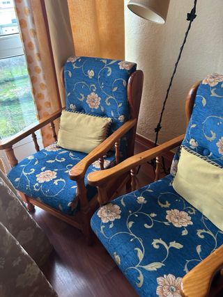 A la venta un conjunto de dos sillones iguales con un bonito estampado floral y orejeras perfecto para descansar. - Diseño floral en tonos beige y rojo. - Tapicería de tela. - Estructura de madera. Es un sofá muy cómodo tanto para sentarse como para dormir ya que tiene unas orejeras y reposabrazos muy cómodos. Precio por los dos