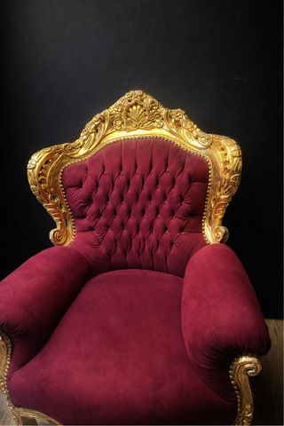 Elegante sillón de estilo barroco, tapizado en terciopelo burdeos de alta calidad, con respaldo capitoné y estructura de madera tallada a mano con acabado dorado envejecido. Una pieza imponente que aporta distinción, lujo y carácter a cualquier espacio. Detalles destacados: • Tapizado en terciopelo suave y resistente • Tallas ornamentales con motivos clásicos • Estructura sólida y cómoda • Ideal para salones, estudios, tocadores, escaparates o decoración vintage Estado: Muy bueno Color: Burdeos y dorado Estilo: Clásico / Barroco / Vintage Perfecto como sillón decorativo