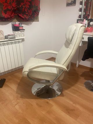 Sillón con base giratoria y reposacabezas. - Diseño moderno y elegante. - Base metálica cromada. - Funda con cremalleras de polipiel (parte del asiento con polipiel desgastada, el resto en perfecto estado).